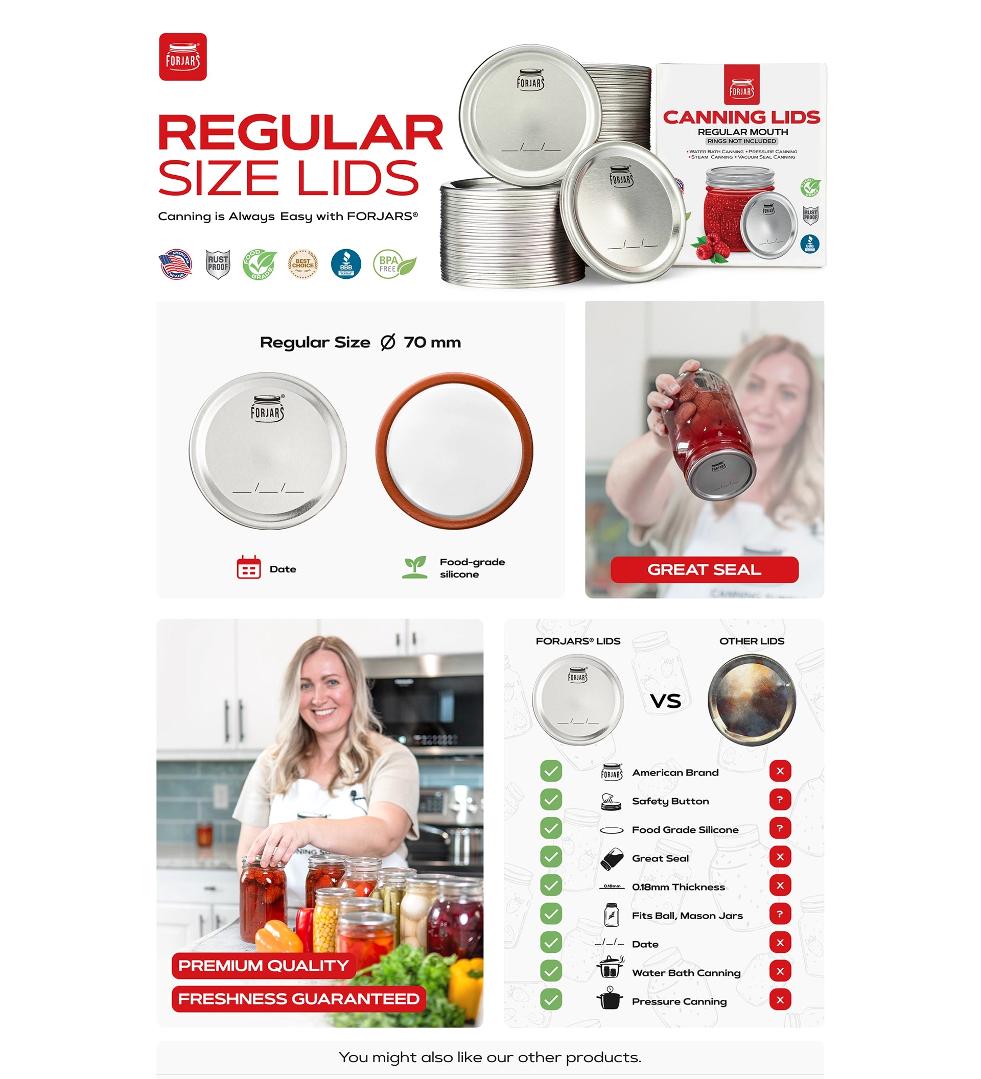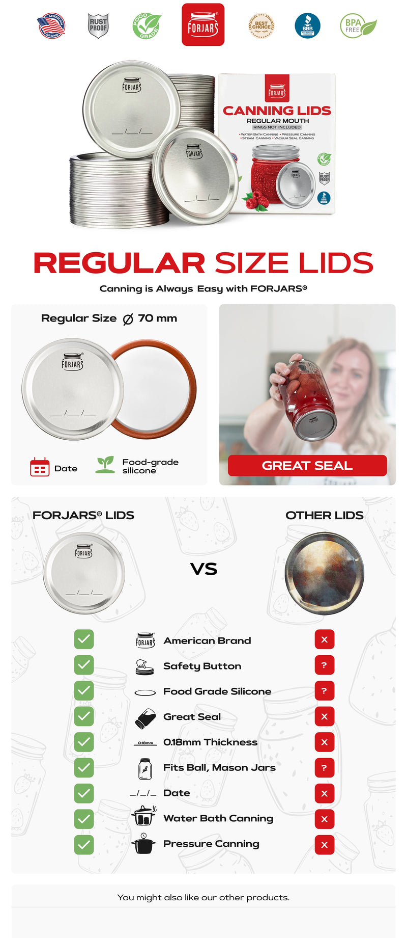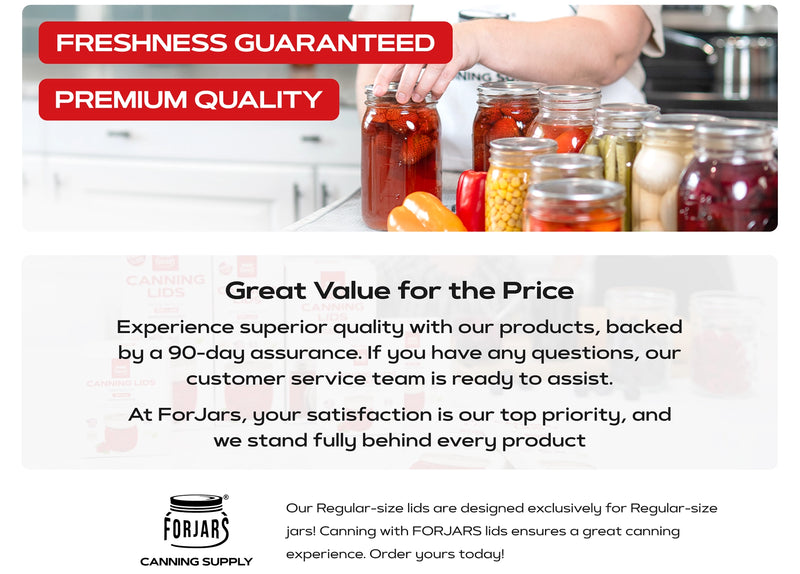 Safe for boiling and pressure cooking, these canning lids will provide dependable and safe seals for all your canning needs. From salsa, pickles, to turkey broth, these Forjars Canning Lids are the affordable alternative you have been looking for all this time. Well search no more! Order today and discover for yourself why these canning lids are recommended by expert canners all over the USA.