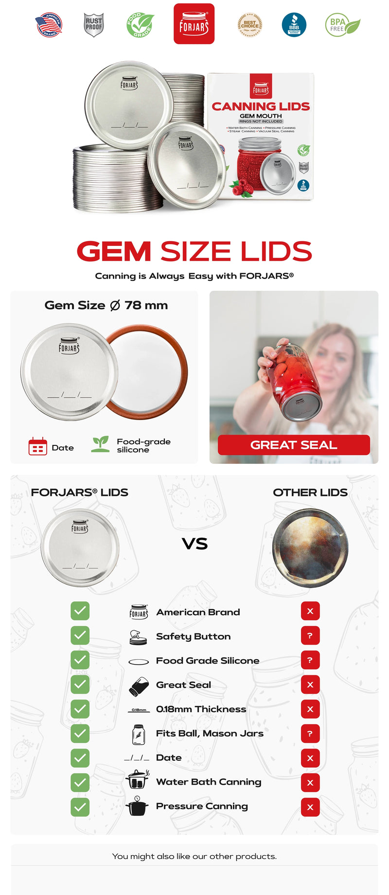 Safe for boiling and pressure cooking, these canning lids will provide dependable and safe seals for all your canning needs. From salsa, pickles, to turkey broth, these Forjars Canning Lids are the affordable alternative you have been looking for all this time. Well search no more! Order today and discover for yourself why these canning lids are recommended by expert canners all over the USA.