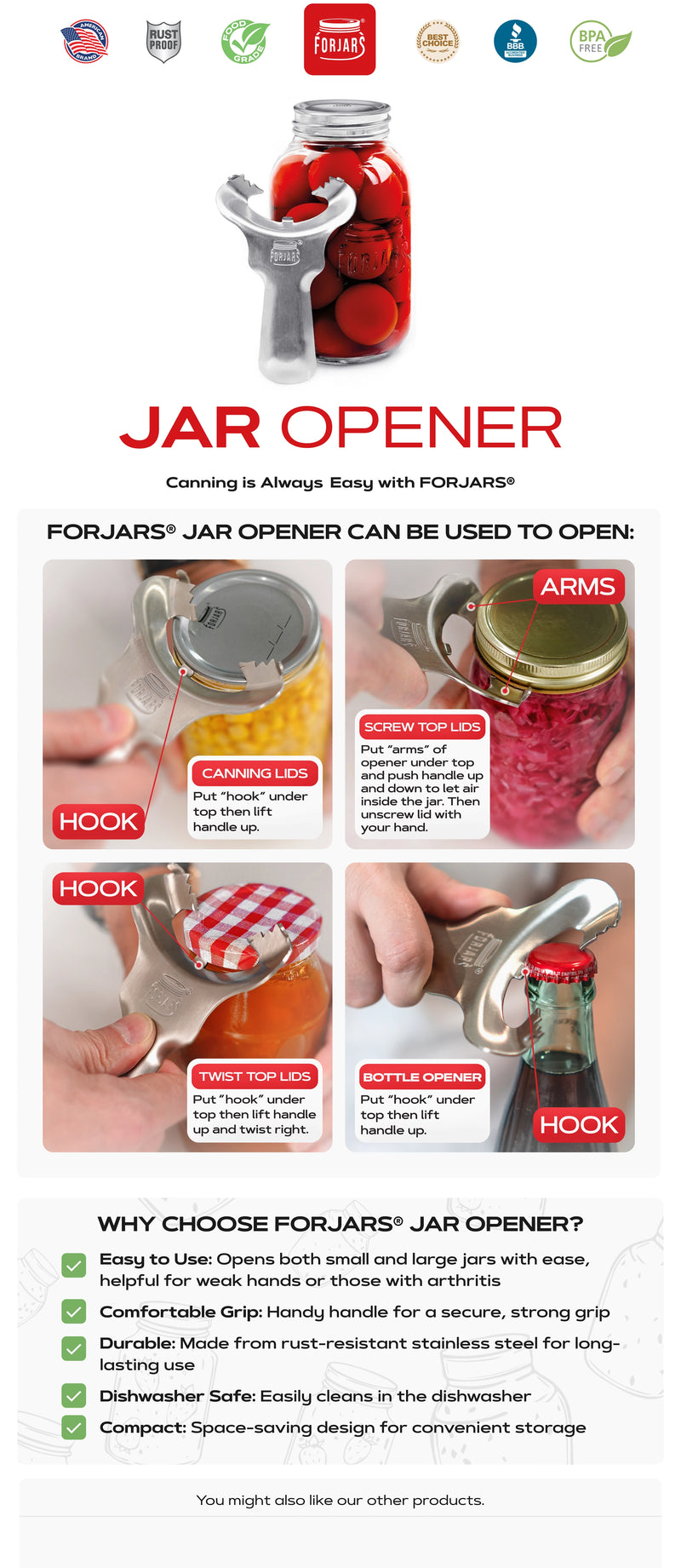 -Screw top lids - put the "arms" of the opener under the top and push the handle up and down to let air inside the jar. Then unscrew the lid with your hand.